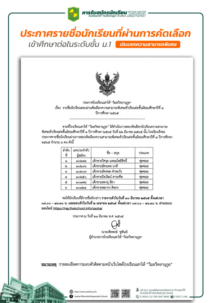 ประกาศ รายชื่อนักเรียนที่สอบผ่านการคัดเลือกเข้าศึกษาต่อในระดับชั้นมัธยมศึกษาปีที่ 1 ประจำปีการศึกษา 2565 ประเภทความสามารถพิเศษ
