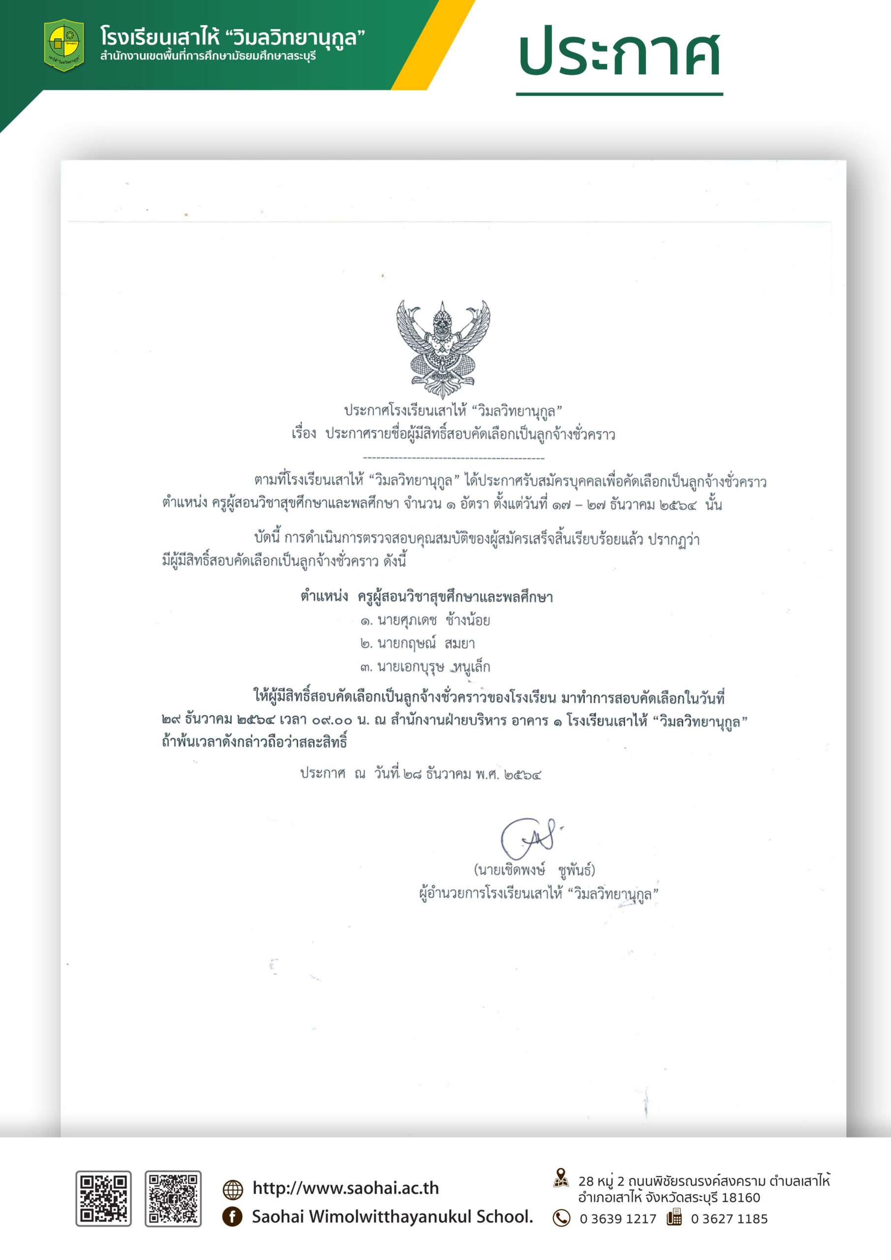 ประกาศรายชื่อ ผู้มีสิทธิ์สอบคัดเลือกเข้าเป็นลูกจ้างชั่วคราว ตำแหน่ง ครูผู้สอน สุขศึกษาและพลศึกษา