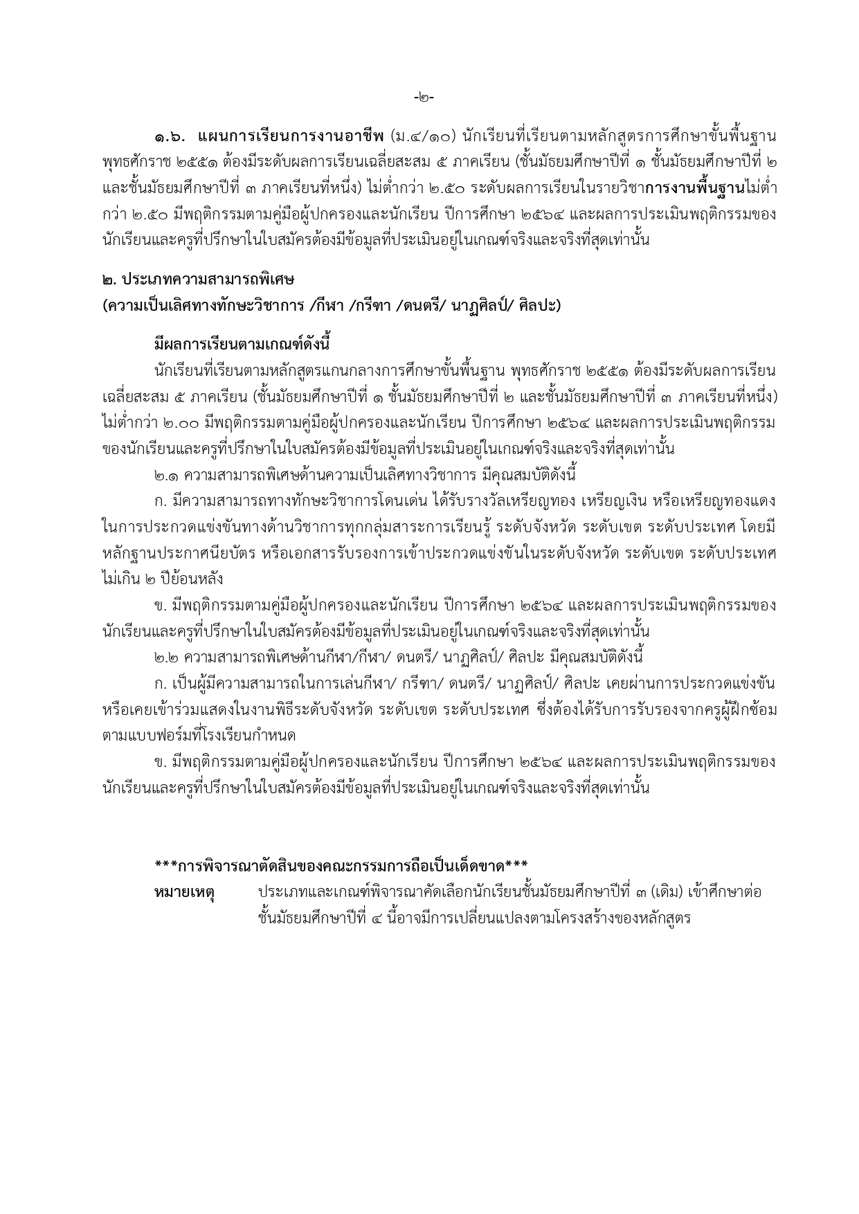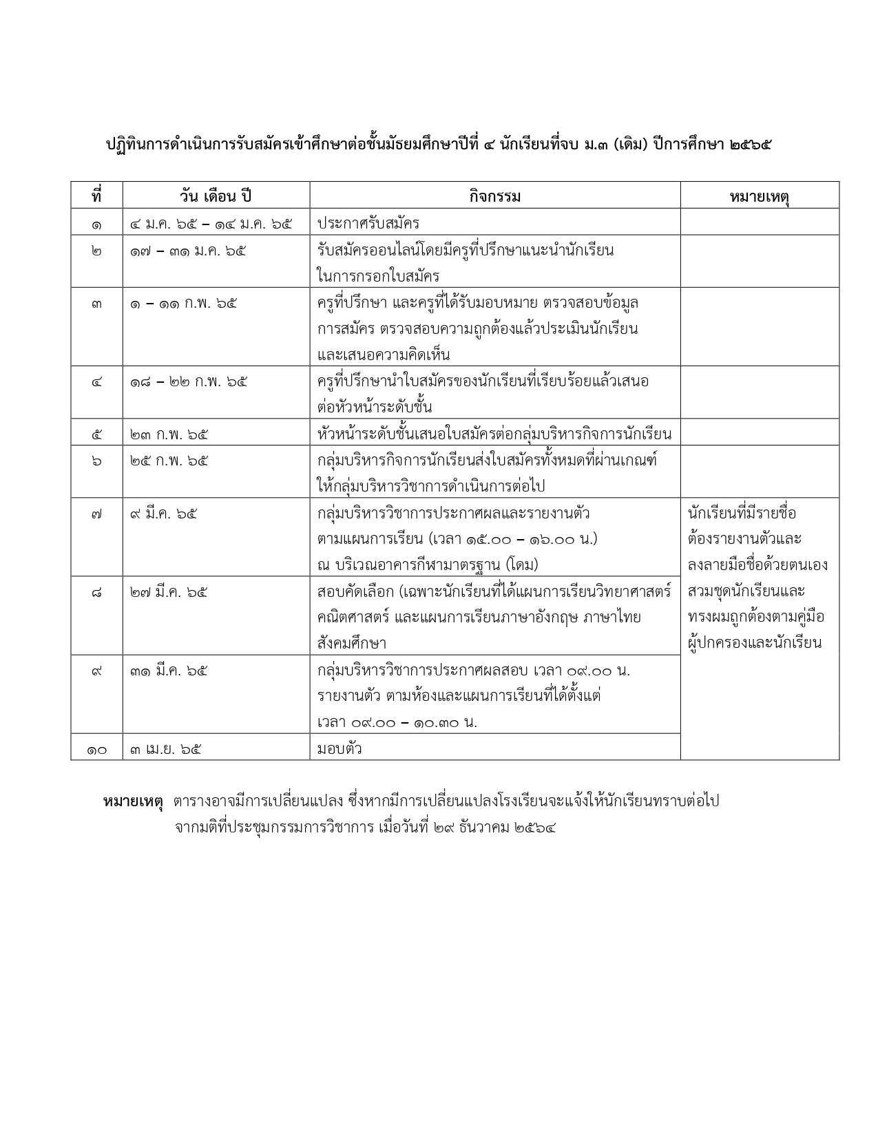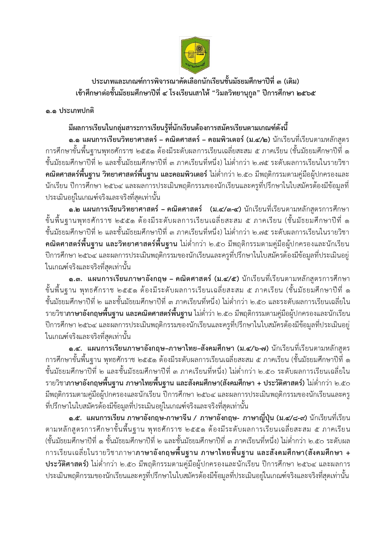 เกณฑ์การรับนักเรียนเข้าศึกษาต่อในระดับชั้น ม.4 ประเภทโค้วตานักเรียนเดิม ประจำปีการศึกษา 2565