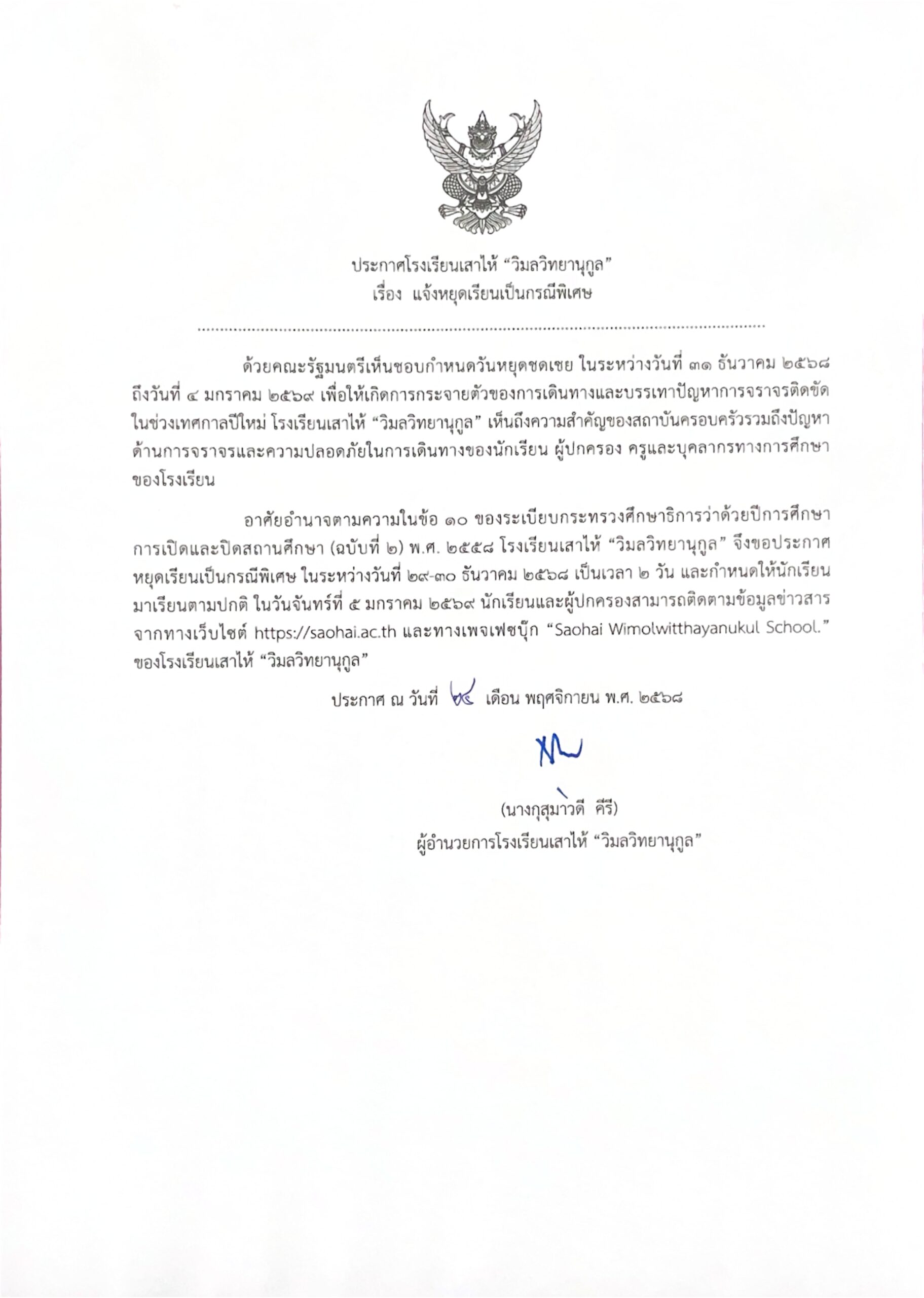ประกาศโรงเรียนเสาไห้ "วิมลวิทยานุกุล" เรื่อง แจ้งหยุดเรียนกรณีพิเศษ เนื่องในเทศกาลส่งท้ายปีเก่า ต้อนรับปีใหม่ 2569